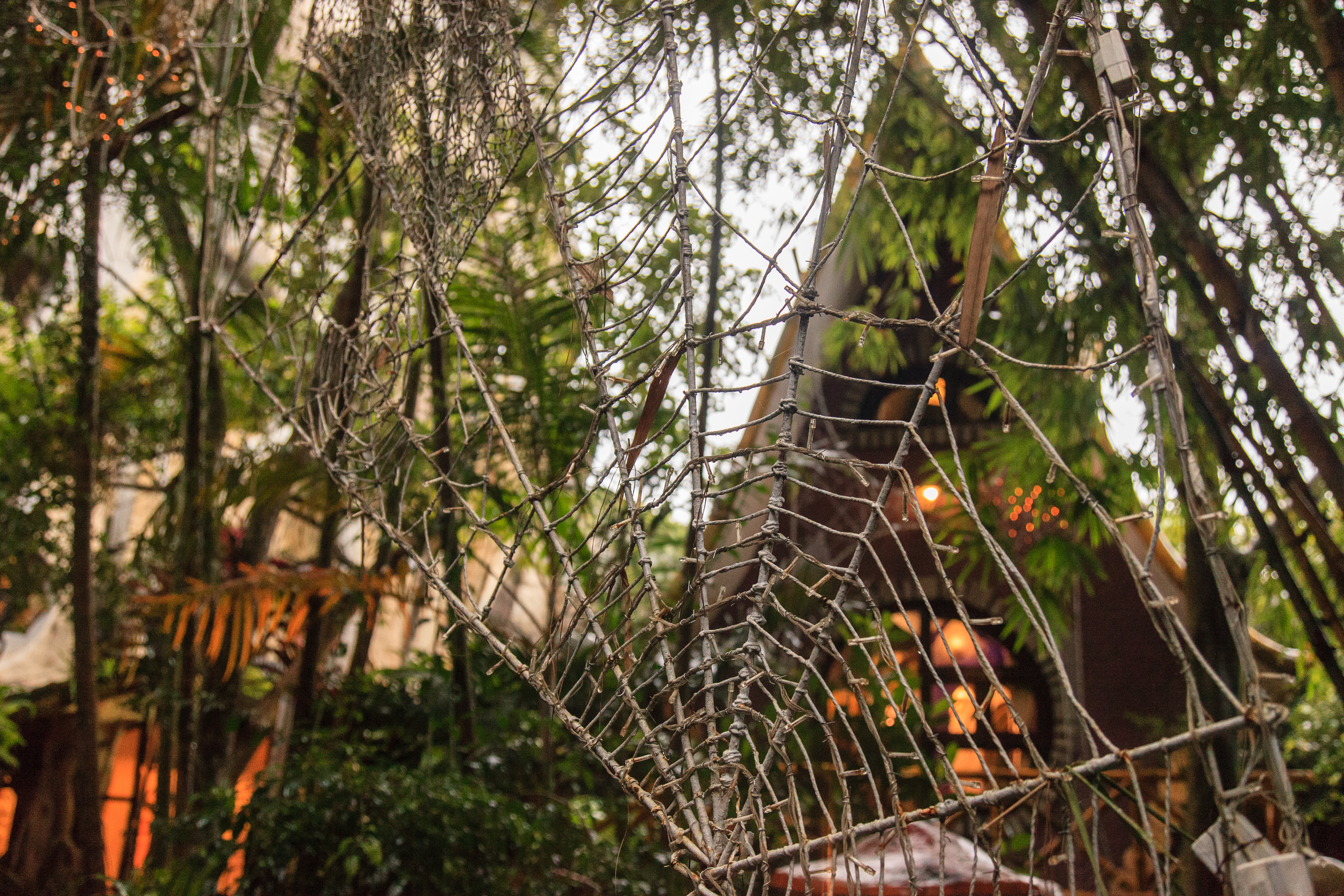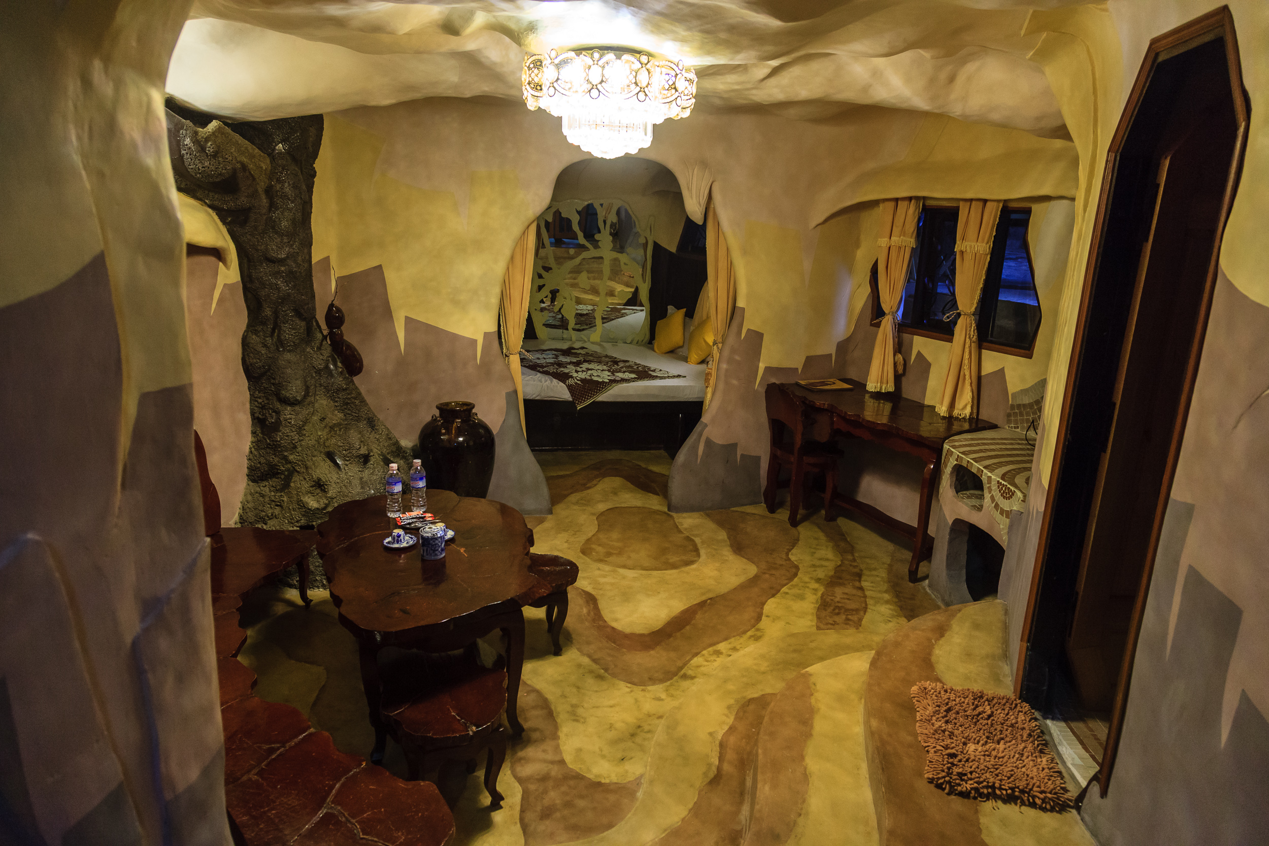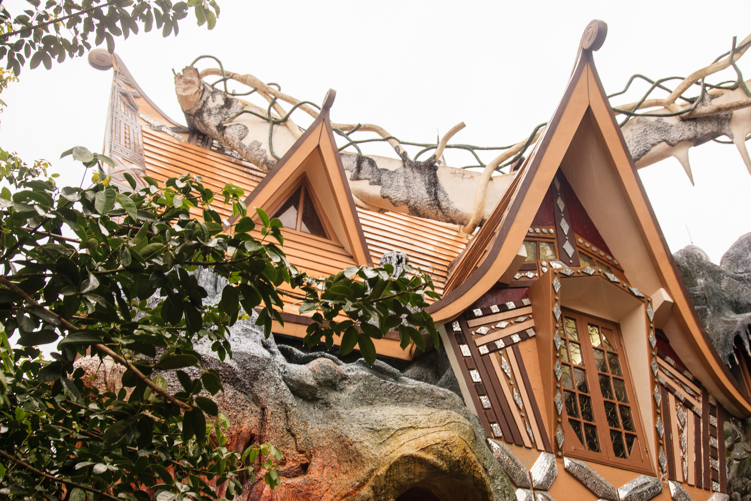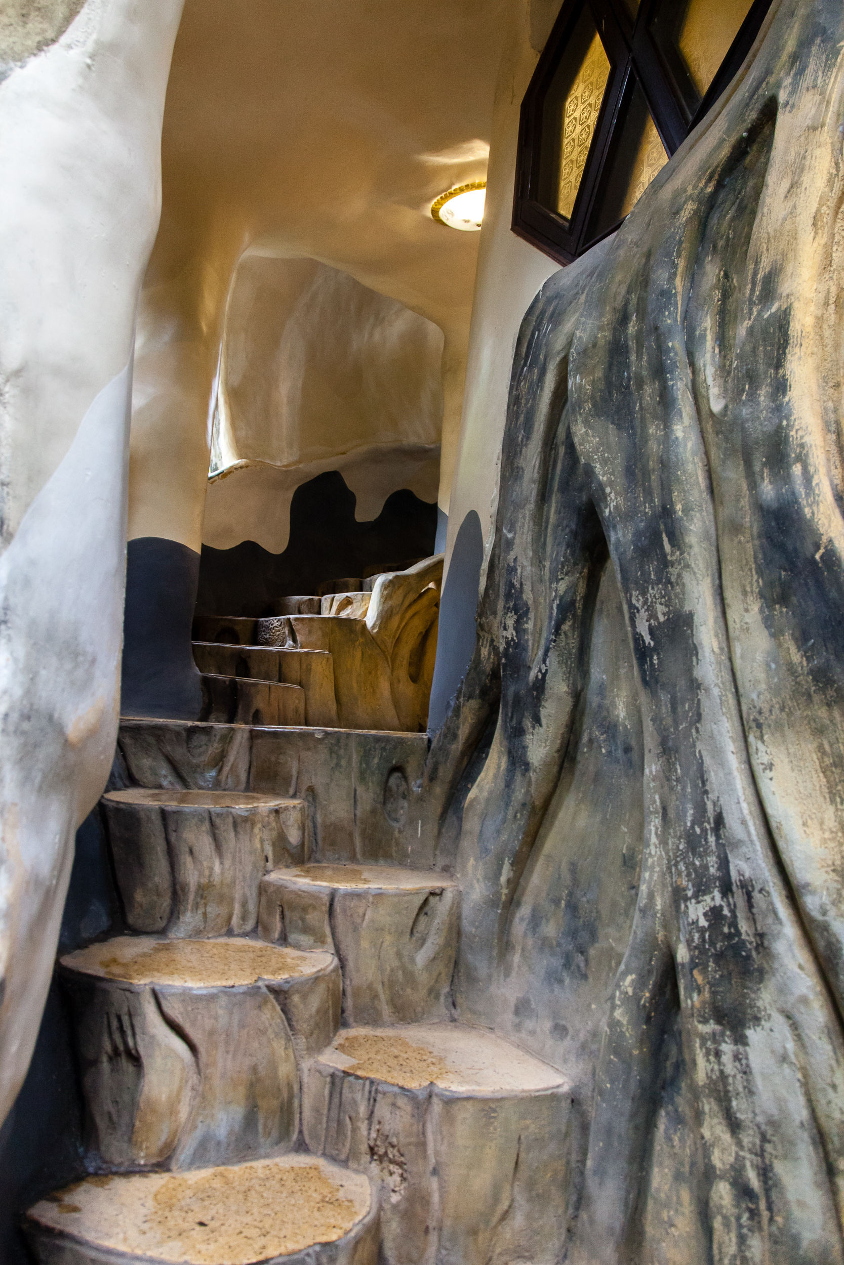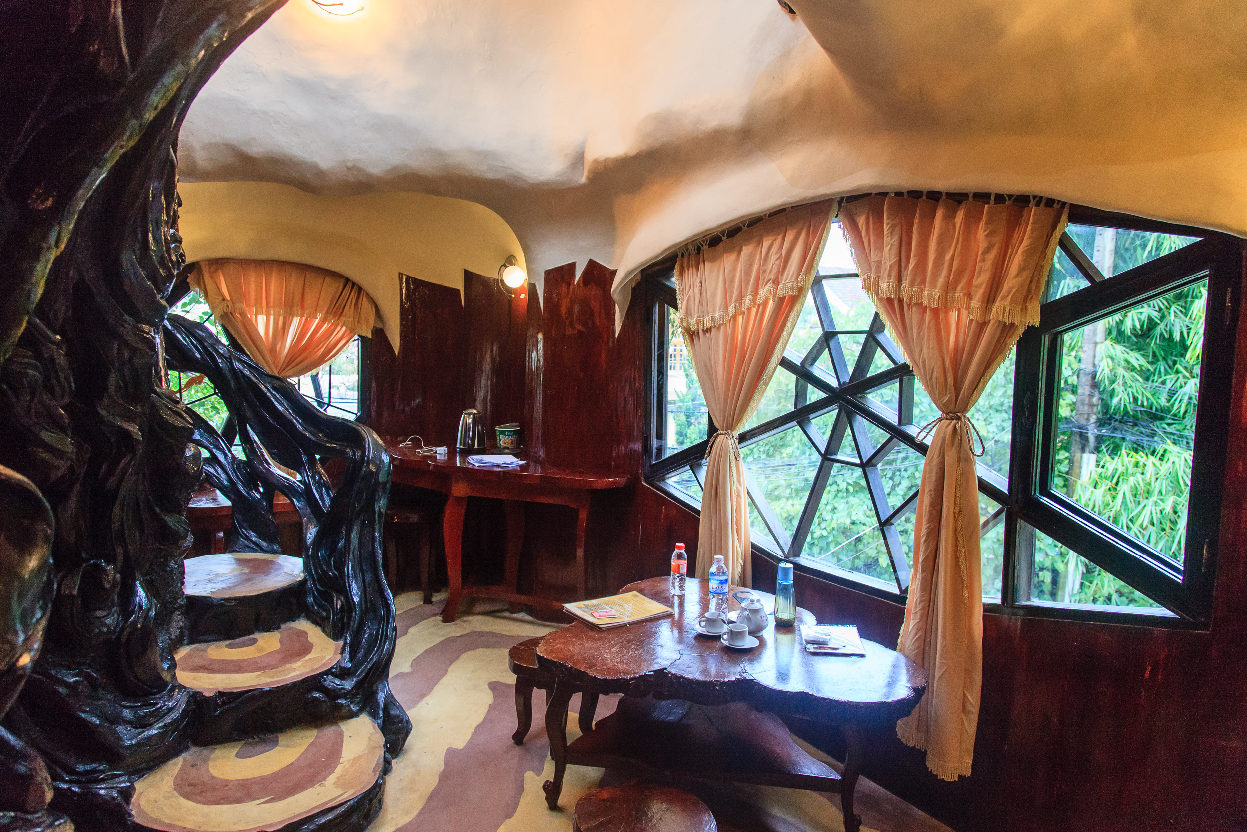 Проводим его в весьма примечательном месте: «Кафе Ста Крыш». Это здание, созданное учеником той женщины-архитектора, которая сделала «Crazy House» и посвященное ей же. Стиль — тоже очень похожий: сказочная фантасмагория, переплетение дерева и камня, отсутствие прямых углов, стены, перетекающие в мебель и все такое прочее. Плюс масса мелких деталей: какие-то маленькие статуэтки, фигурки, картинки — и все это в невероятном лабиринте комнат, лестниц и этажей. Формально это кафе: в самом начале есть маленькая стойка, где можно заказать напиток из небольшого списка; с этим напитком можно уйти дальше, найти в лабиринте комнат уголок со столиком и стульями — и сидеть там, пить свой коктейль и любоваться игрой света на сталактитах, свисающих с потолка.