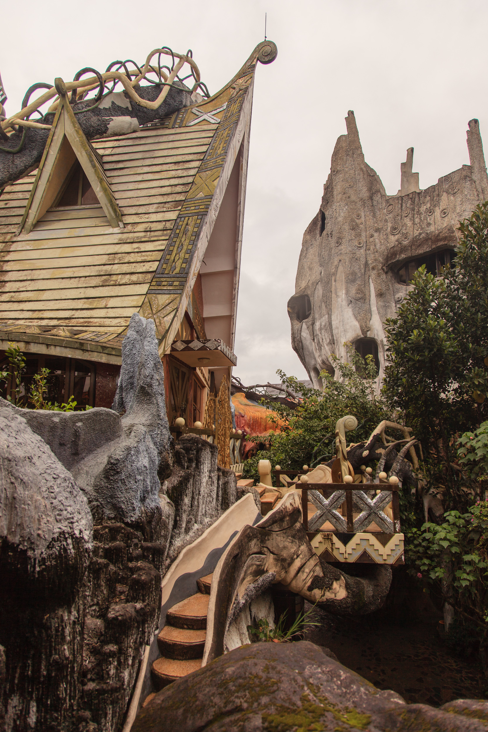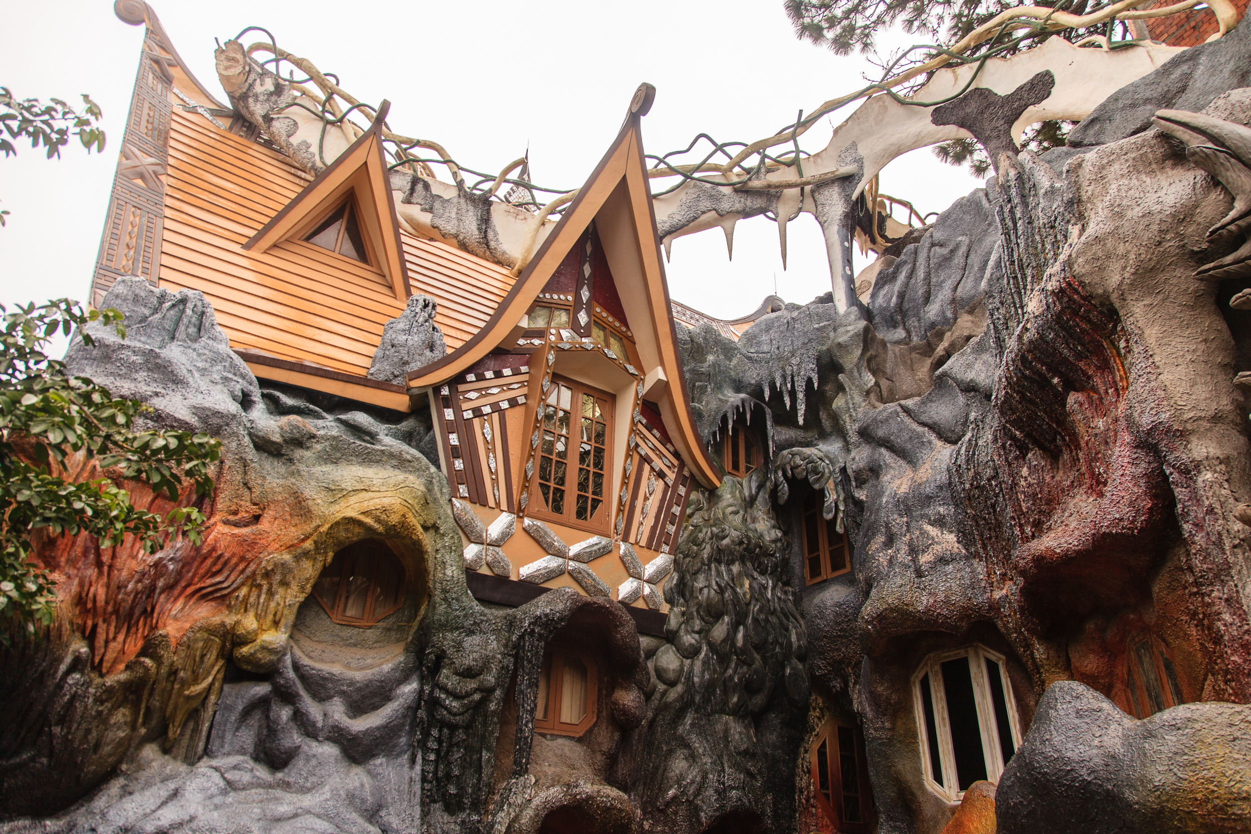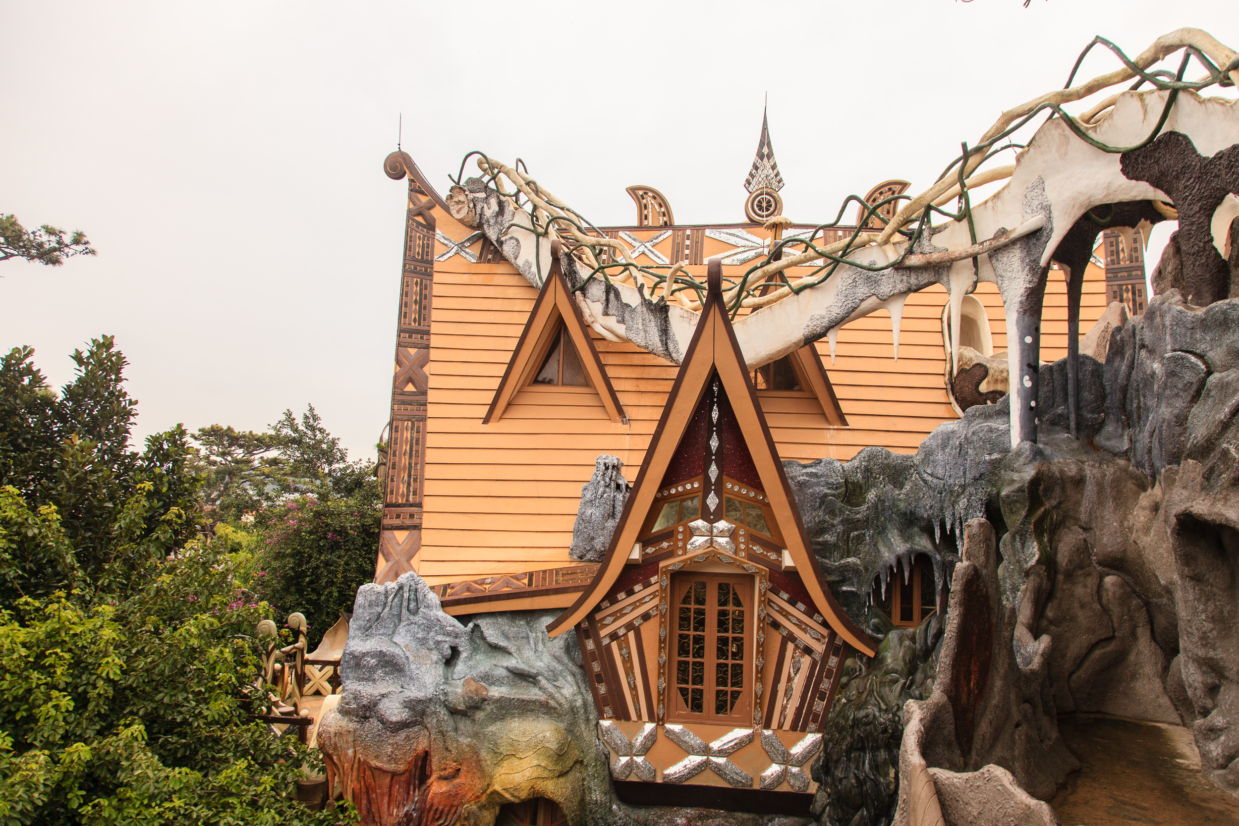 Немного прогулявшись по улочкам и пообедав, пошли смотреть на главную местную достопримечательность — Crazy House, он же "вилла Hang Nga". И это, я вам скажу, просто отвал башки. Фотографии не передают и сотой части его крутизны, да и словами описывать очень сложно, но я попробую. Это дом (вернее, несколько зданий), символизирующий единение архитектуры с природой: стены волшебного терема вырастают из земли окаменевшими древесными стволами, переплетаются ветвями и перетекают друг в друга потоками застывшей лавы. Ни одного прямого угла, ни одного повторяющегося элемента. Внутри — лабиринт комнат и коридоров, лесные берлоги соседствуют с пчелиными ульями, а птичьи гнезда - с покрытыми сталактитами пещерами; снаружи — переплетение узких лесенок-переходов, башенок и острых коньков крыш.
