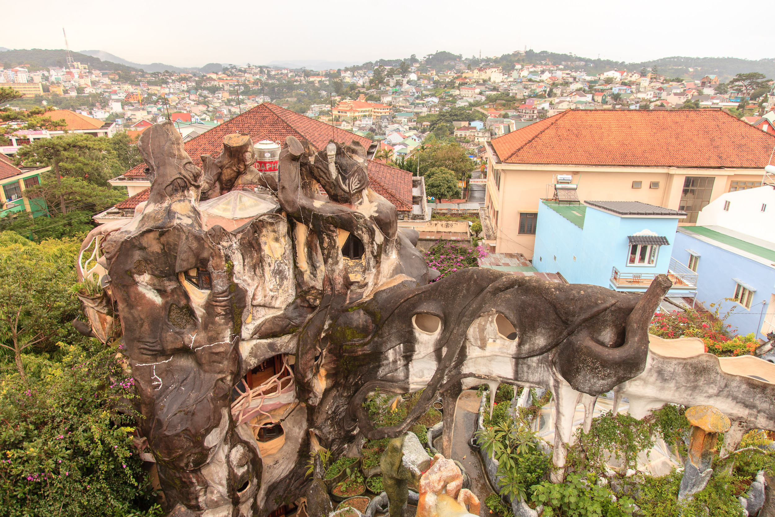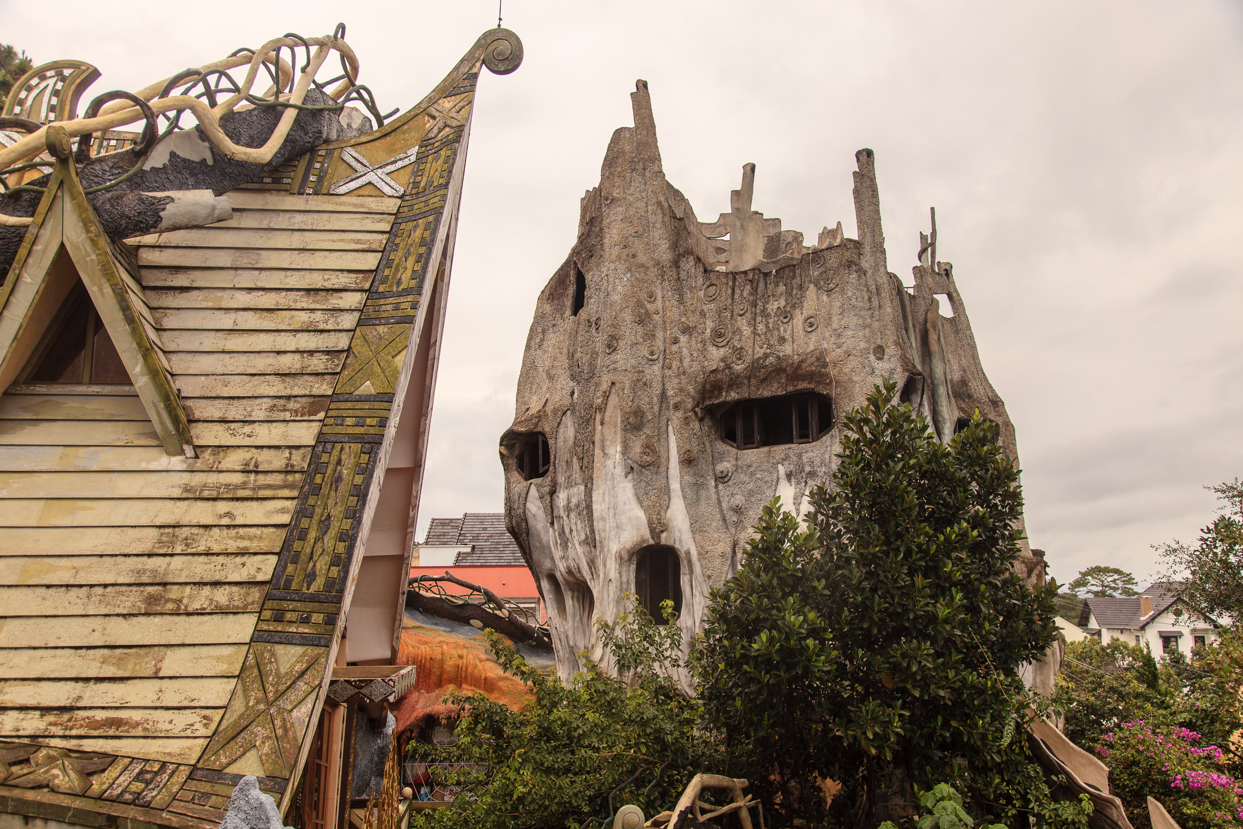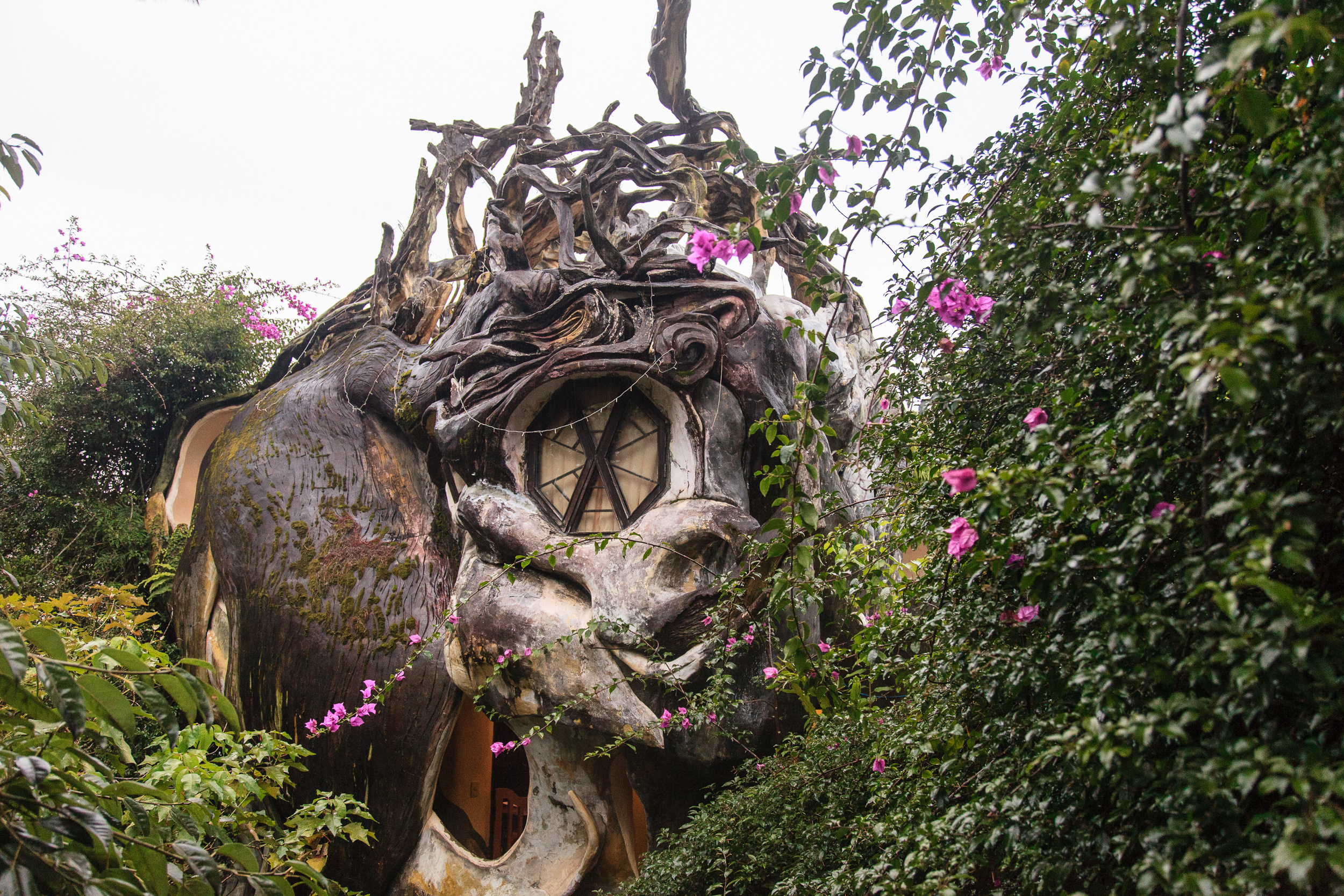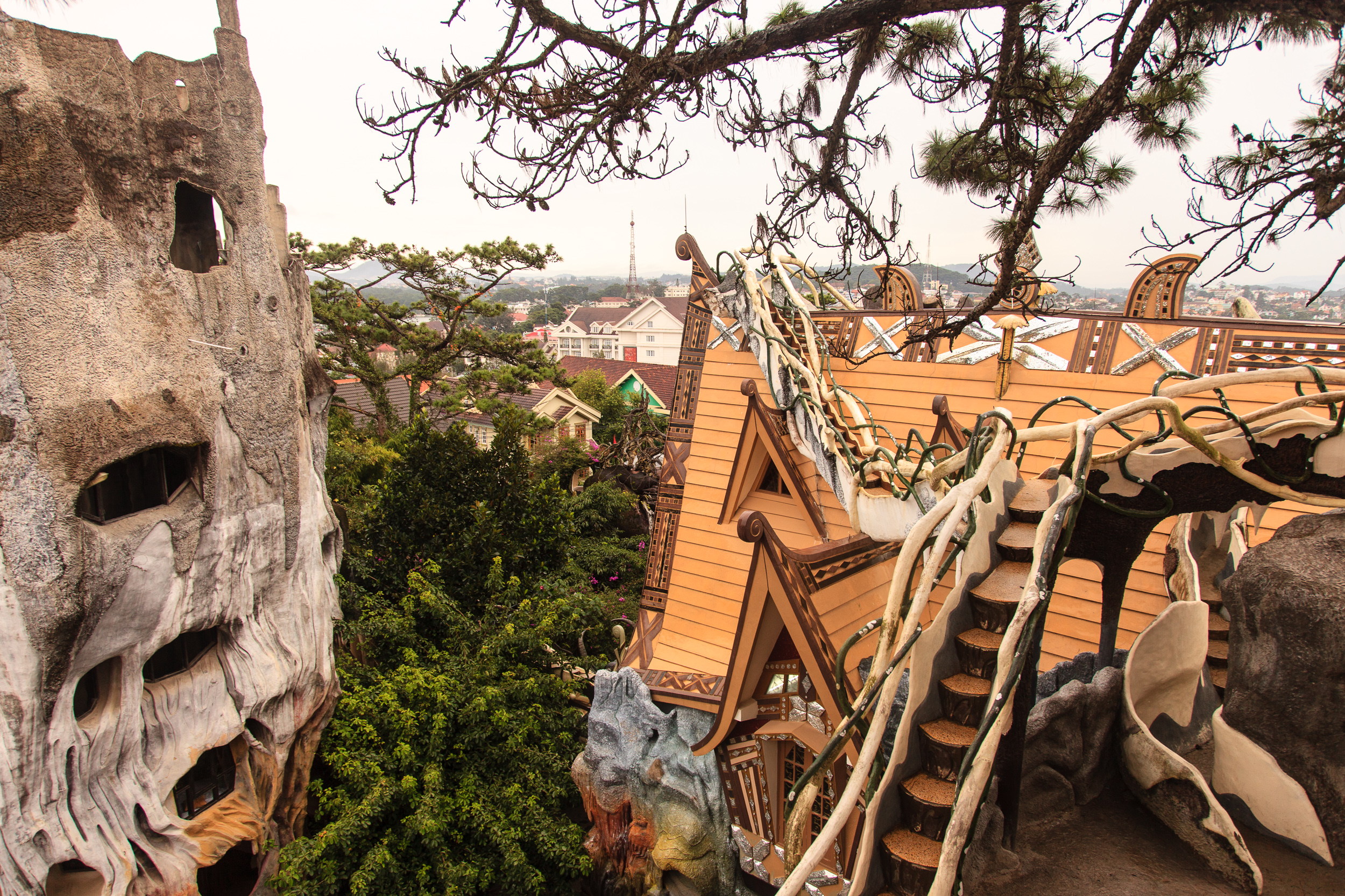 Немного прогулявшись по улочкам и пообедав, пошли смотреть на главную местную достопримечательность — Crazy House, он же "вилла Hang Nga". И это, я вам скажу, просто отвал башки. Фотографии не передают и сотой части его крутизны, да и словами описывать очень сложно, но я попробую. Это дом (вернее, несколько зданий), символизирующий единение архитектуры с природой: стены волшебного терема вырастают из земли окаменевшими древесными стволами, переплетаются ветвями и перетекают друг в друга потоками застывшей лавы. Ни одного прямого угла, ни одного повторяющегося элемента. Внутри — лабиринт комнат и коридоров, лесные берлоги соседствуют с пчелиными ульями, а птичьи гнезда - с покрытыми сталактитами пещерами; снаружи — переплетение узких лесенок-переходов, башенок и острых коньков крыш.