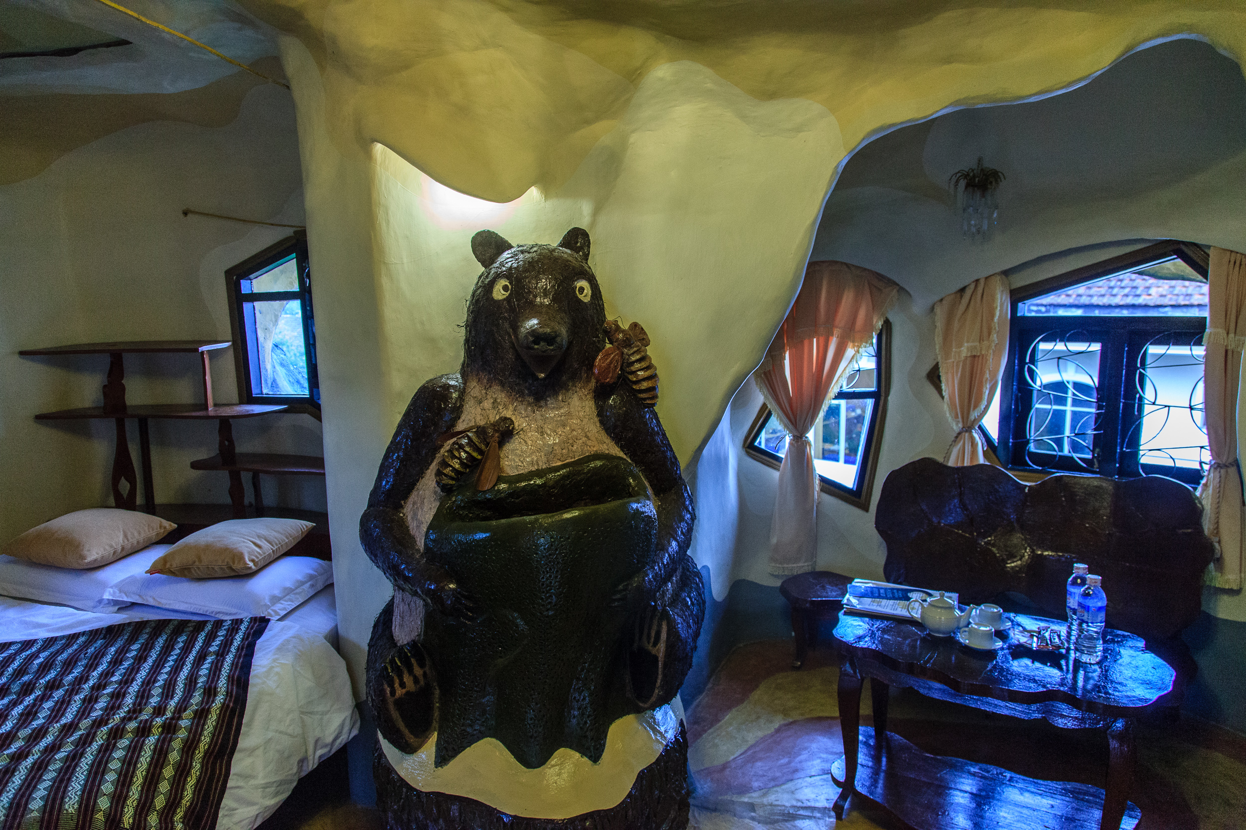 И еще. В этом фантастическом здании можно жить, как в отеле: для того, чтобы хоть как-то окупить создание и содержание этого шедевра, автор решила сделать в нем несколько комнат и сдавать их как будто это обычный мини-отель. Каждая комната - маленькое произведение искусство, посвященное какому-то животному и ассоциирующейся с ним страной. Мы видели комнаты кенгуру (Австралия), тигра (Китай), медведя (Россия), орла (США), муравья (Вьетнам)... Каждая комната уникальна, оформлена в соответствующем стиле, с изображением своего "тотемного" животного, вся мебель и прочий интерьер созданы специально для каждой комнаты. И, кстати, совсем недорого — так что можно и остановиться тут на ночь. Если не испугаешься: дом-то ощутимо живой, порой кажется что он следит за каждым твоим шагом :)