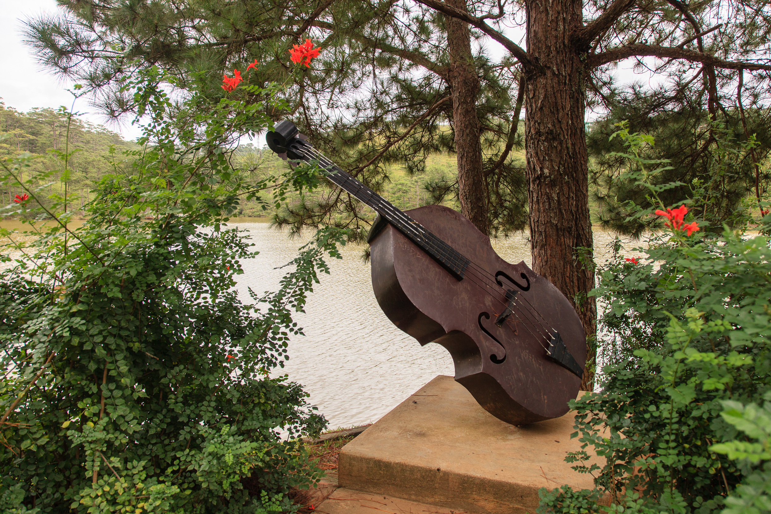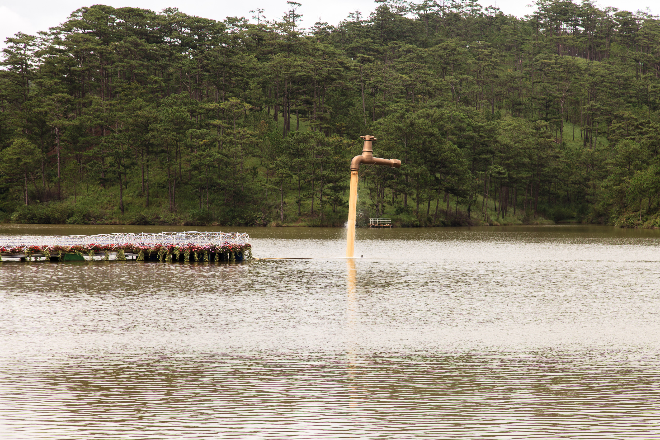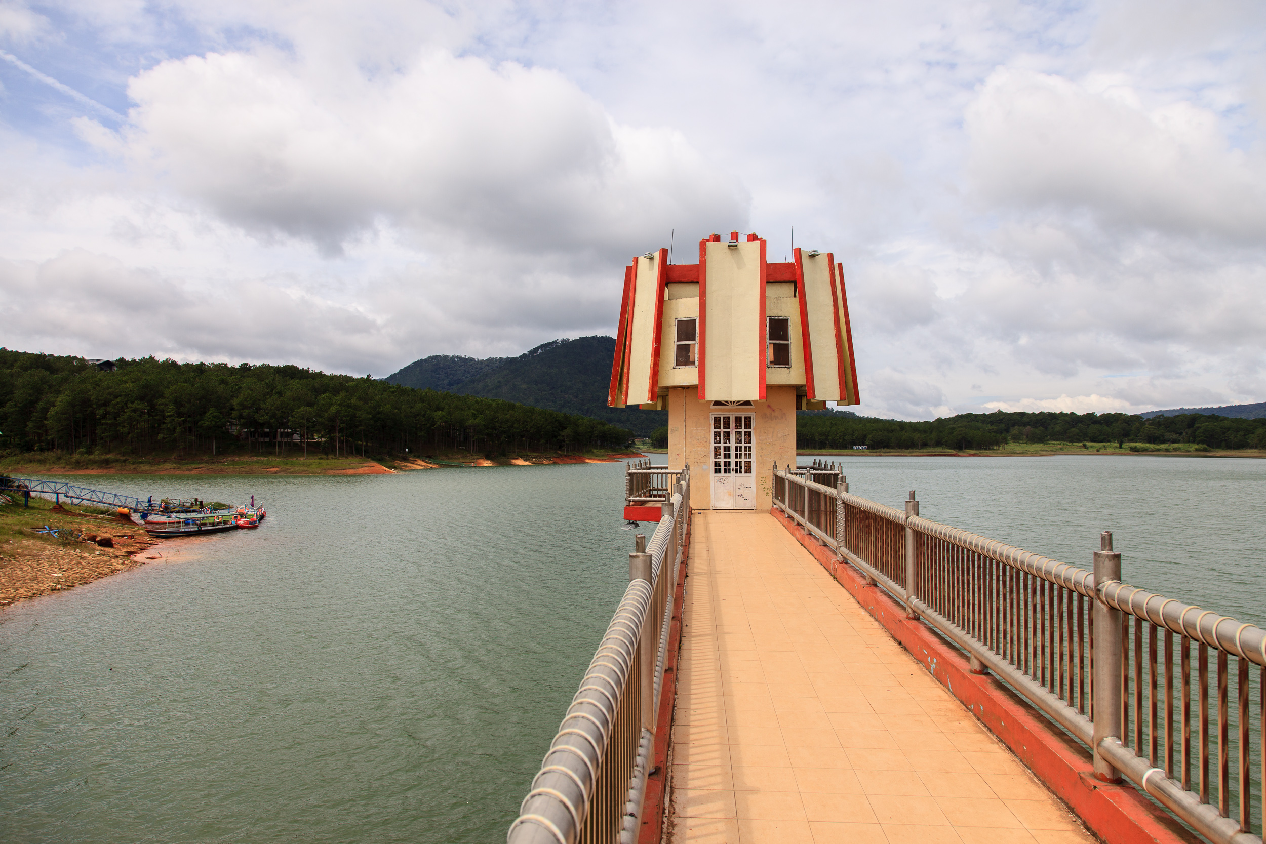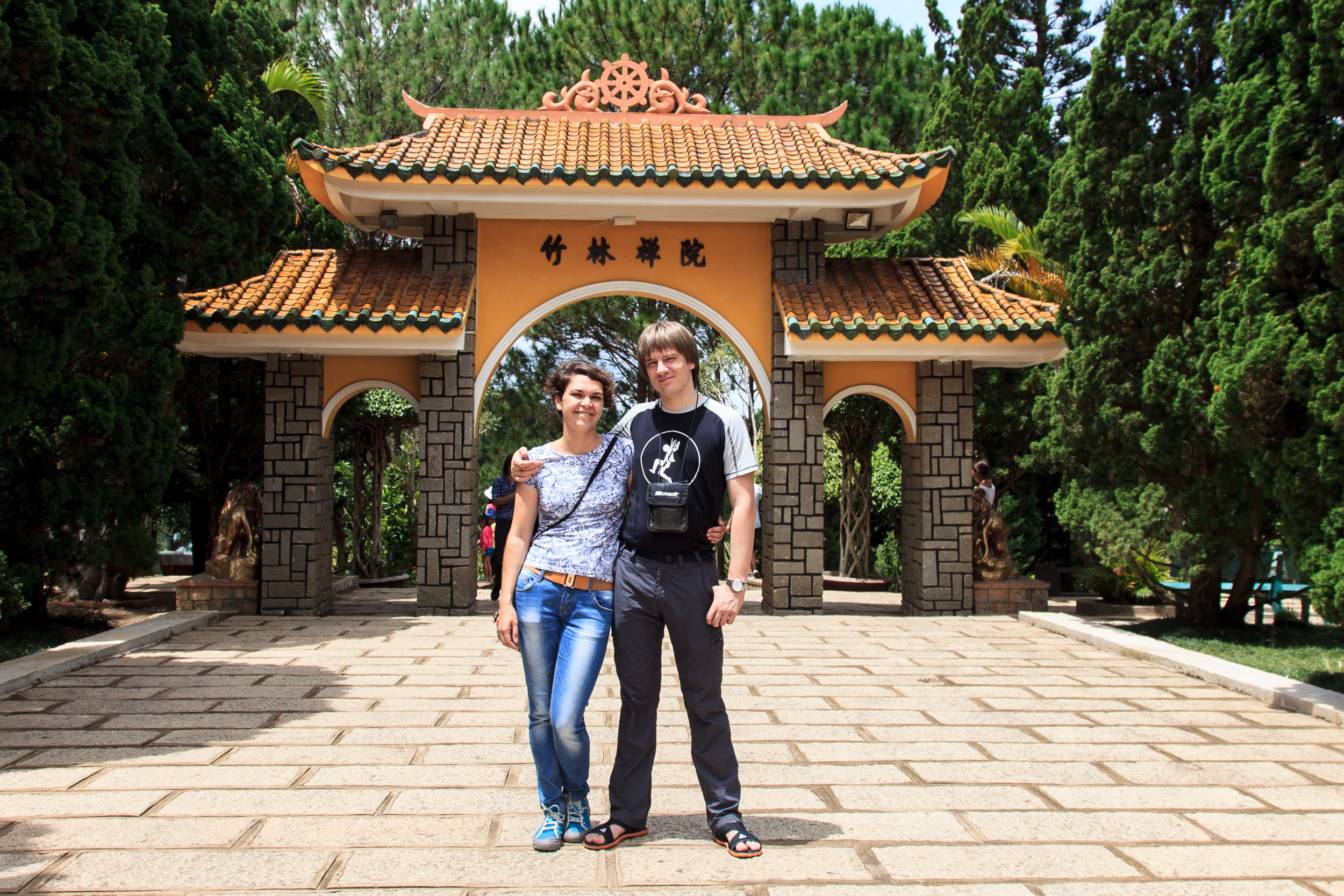 Вернувшись с водопадов грузимся в машину и едем на следующий пункт: расположенное неподалеку озеро Трук Лам. Делать там оказывается нечего: средних размеров водохранилище, чьи берега популярны среди местных как один из пунктов свадебной прогулки. Ну, там, сфоткаться на мостике у воды, повесить замок на ограждение (да, вьетнамцы тоже делают это), поплавать на катамаранчике в форме лебедя, вот это всё. Поняв всё это и решив, что мы чужие на этом празднике жизни, двигаемся дальше — к Пагоде Трук Лам.