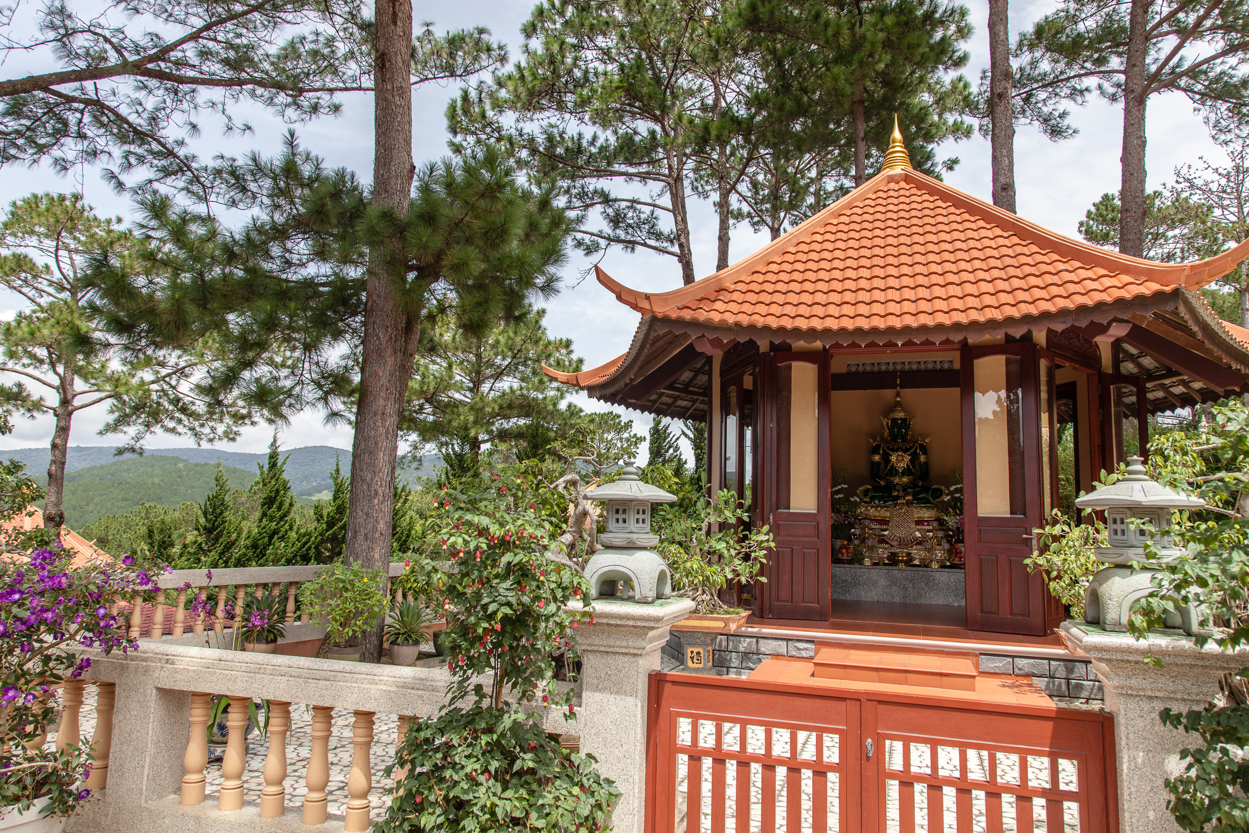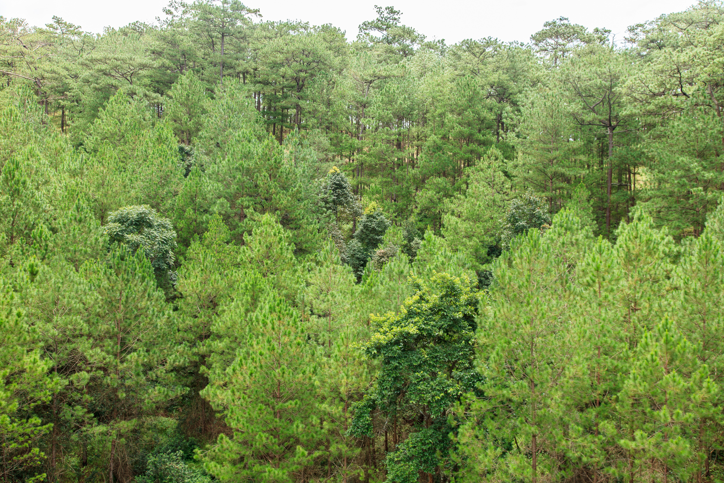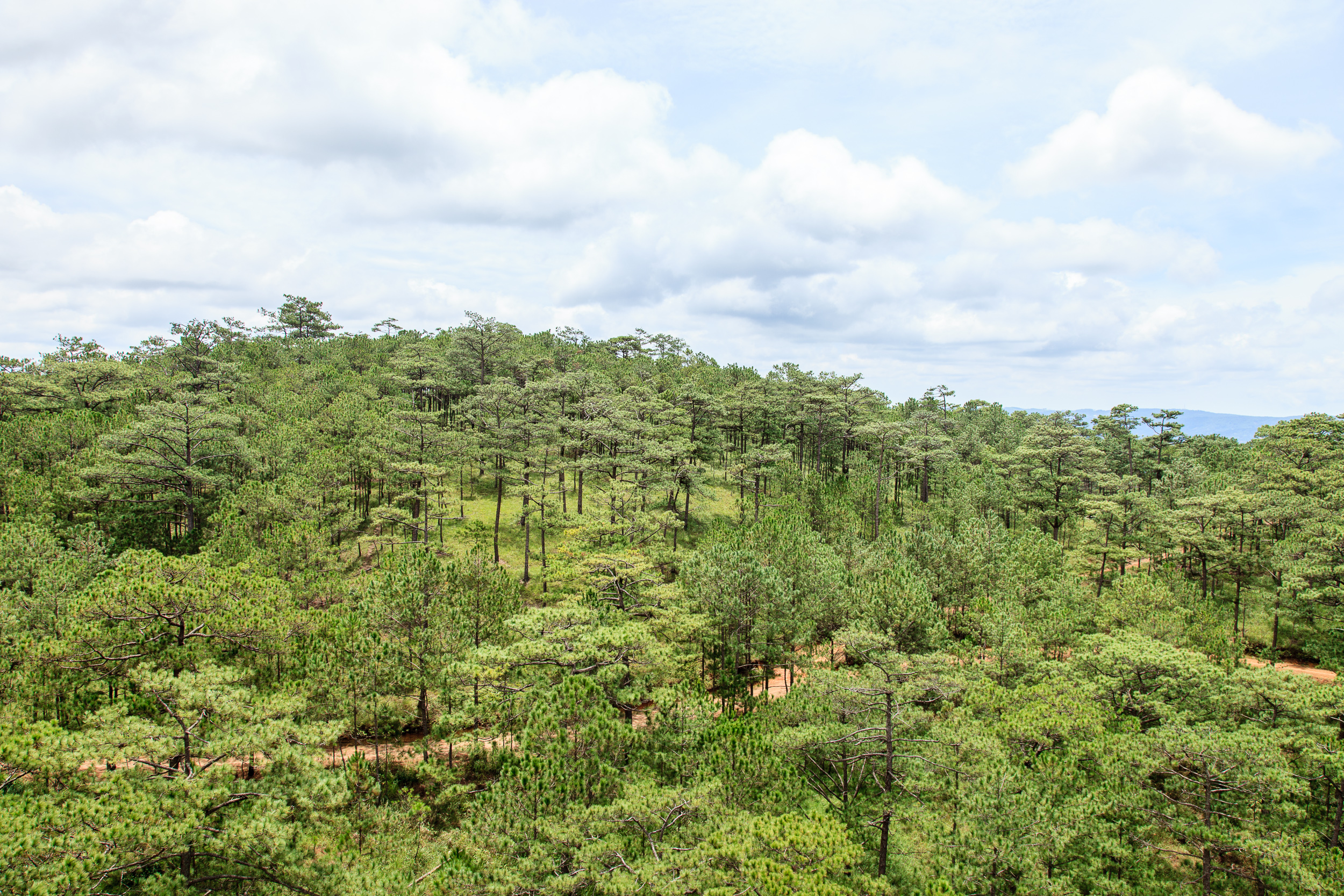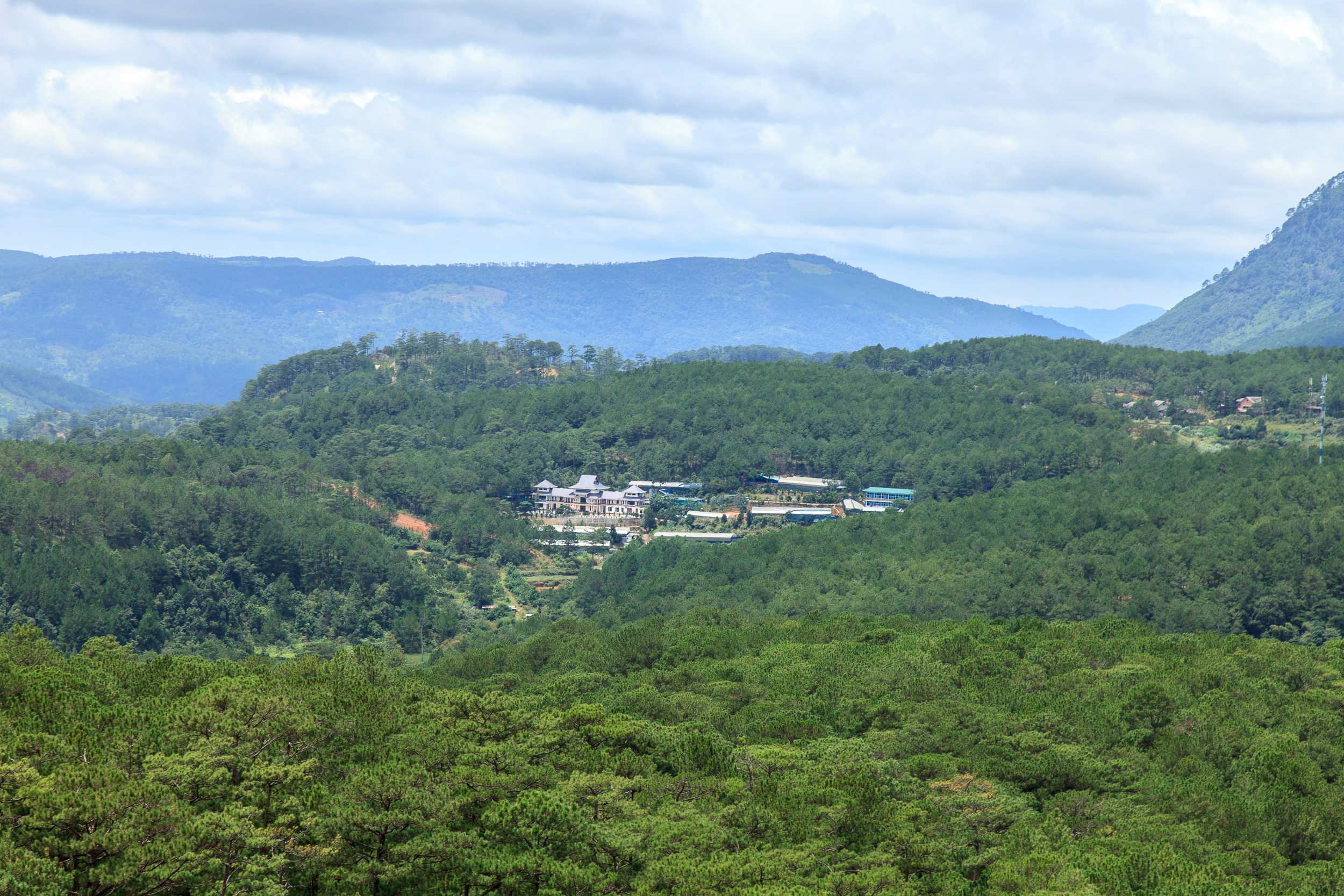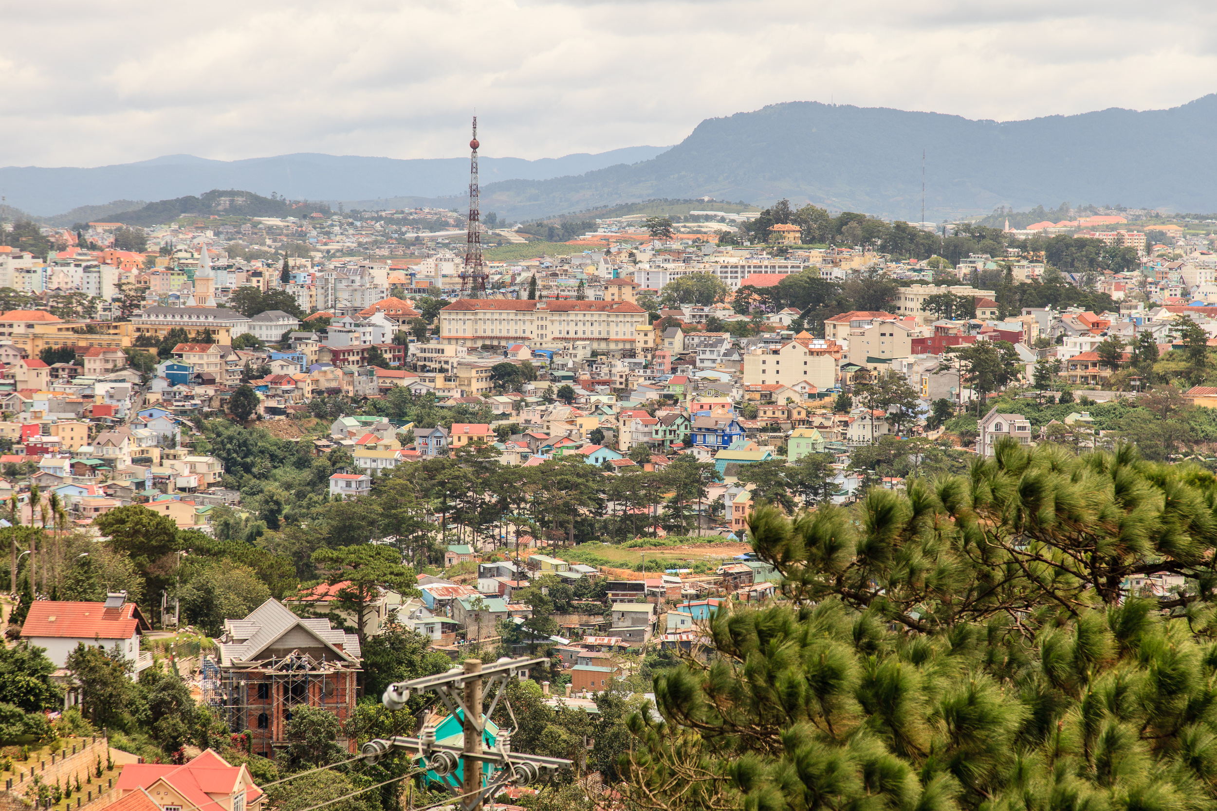 Спускаемся из монастыря к станции канатной дороги: отсюда ходит фуникулер в сторону Далата. Длинная канатка идет над фантастической красоты сосновыми лесами, да и виды на окрестные горы и сам Далат просто прекрасны. Терминал дороги расположен на холме в паре километров от центра города, здесь есть и неплохая смотровая площадка, тоже с панорамными видами. Вот тут мне Далат действительно напомнил Париж, как он выглядит с Монмартра: множество разнообразных крыш, шпили соборов, Эйфелева башня..