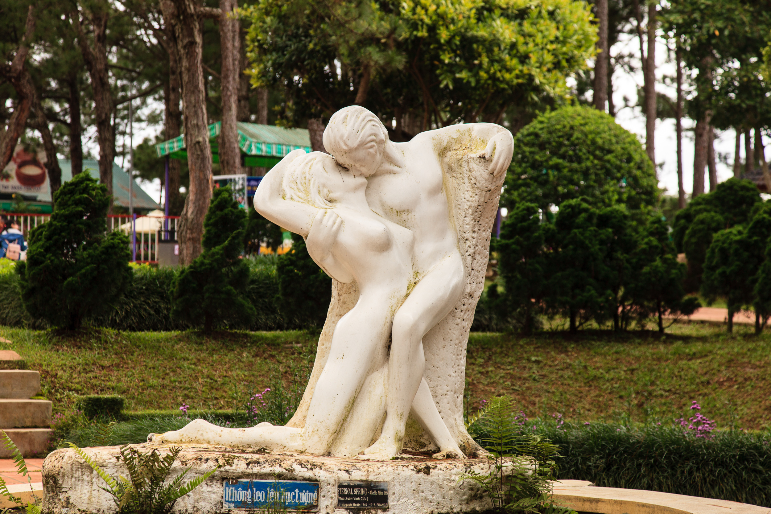 Ну, не знаю что романтичного в расположенном посередине озера гигантском “волшебном кране” — чем-то типа фонтана в виде “левитирующего” крана от умывальника, из которого бьет струя мутной желтой воды. Видимо это считается оригинальным — прямо перед этим самым “краном” оборудована площадка для выездных свадебных церемоний. Но всё остальное соответствует описанию: сердечки-колечки-голубки, масса цветов, всякие лавочки для влюбленных, целующиеся статуи, свадебные кареты и прочее такое.