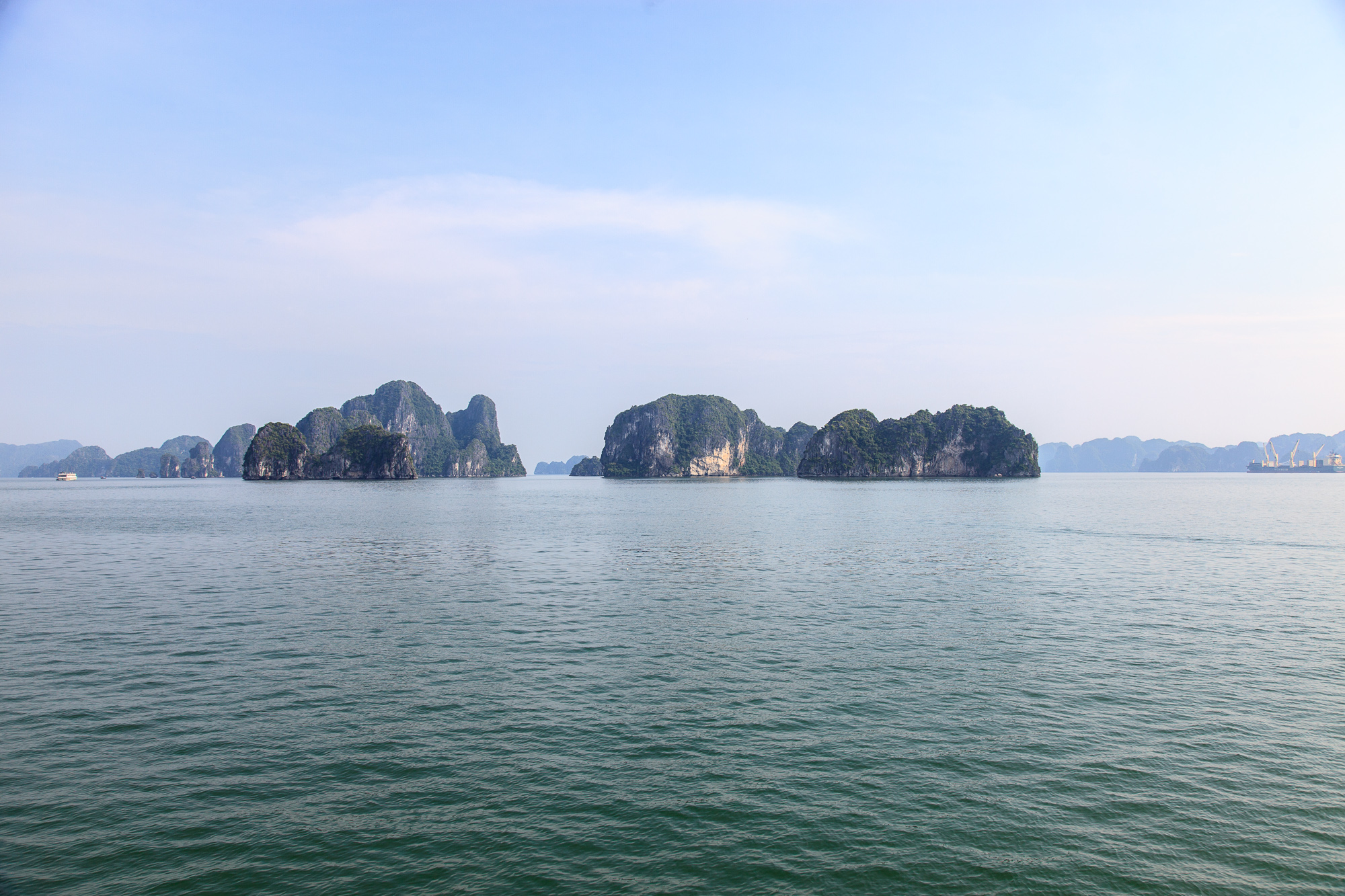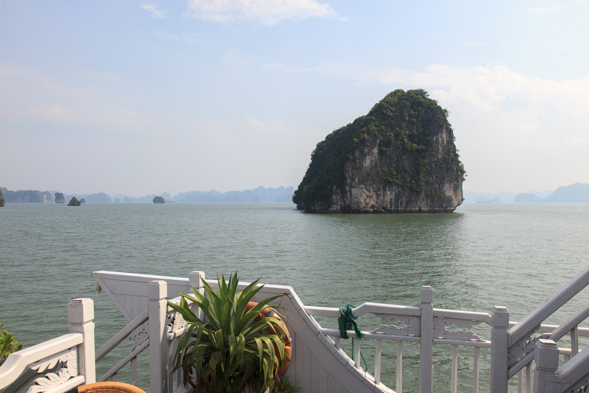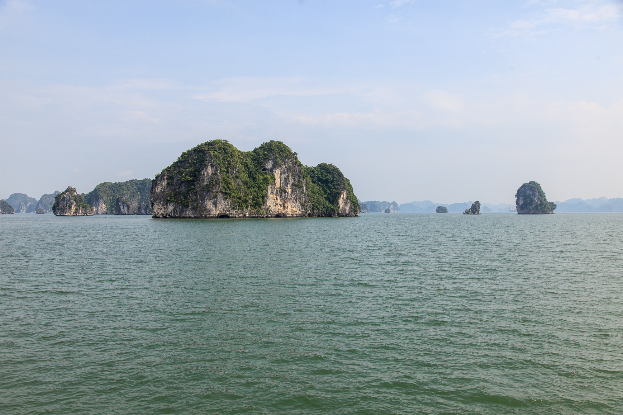 Правда надо понимать, что те красивые фоточки с ярко-голубыми небом и морем, которые украшают все буклеты и путеводители про Халонг, сделать скорее всего не получится: бОльшую часть времени над заливом висит тонкая белесая дымка, и небесной синевы почти никогда не видно. Виды все равно отличные — но чуть менее открыточные, чем можно было бы ожидать.