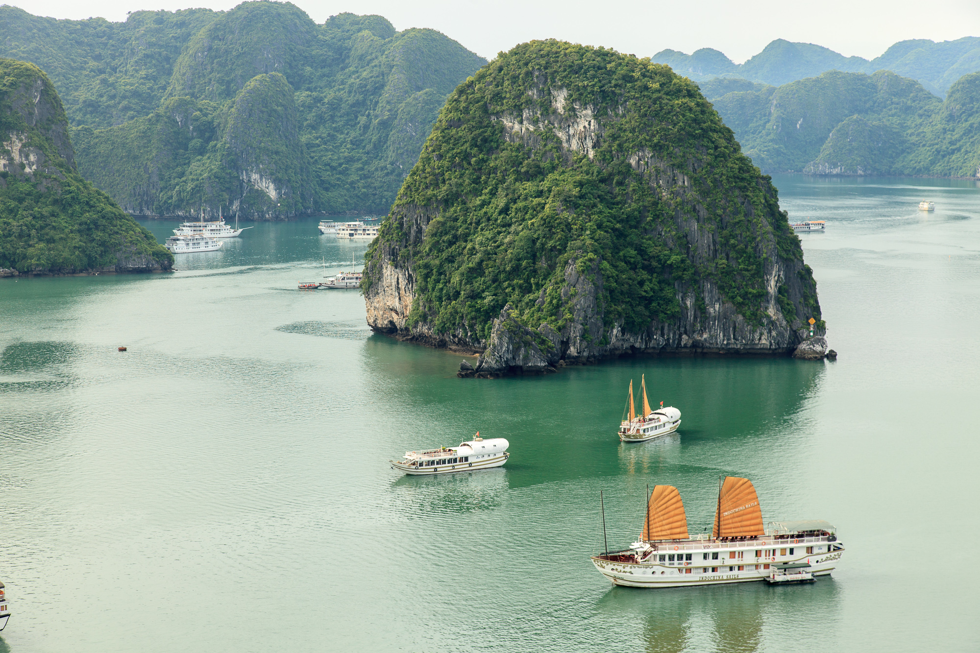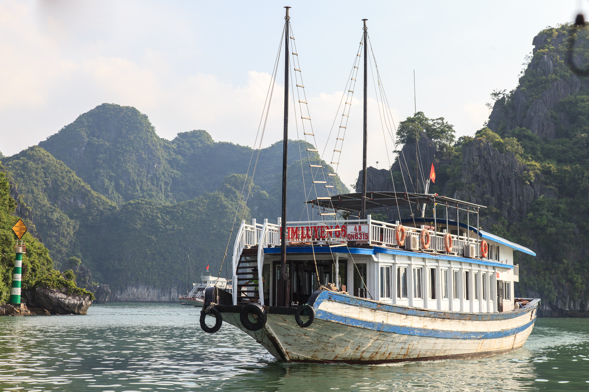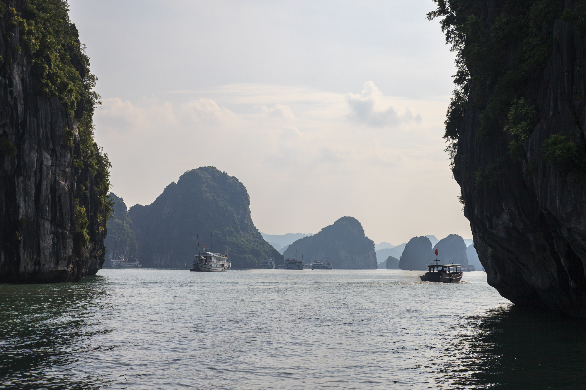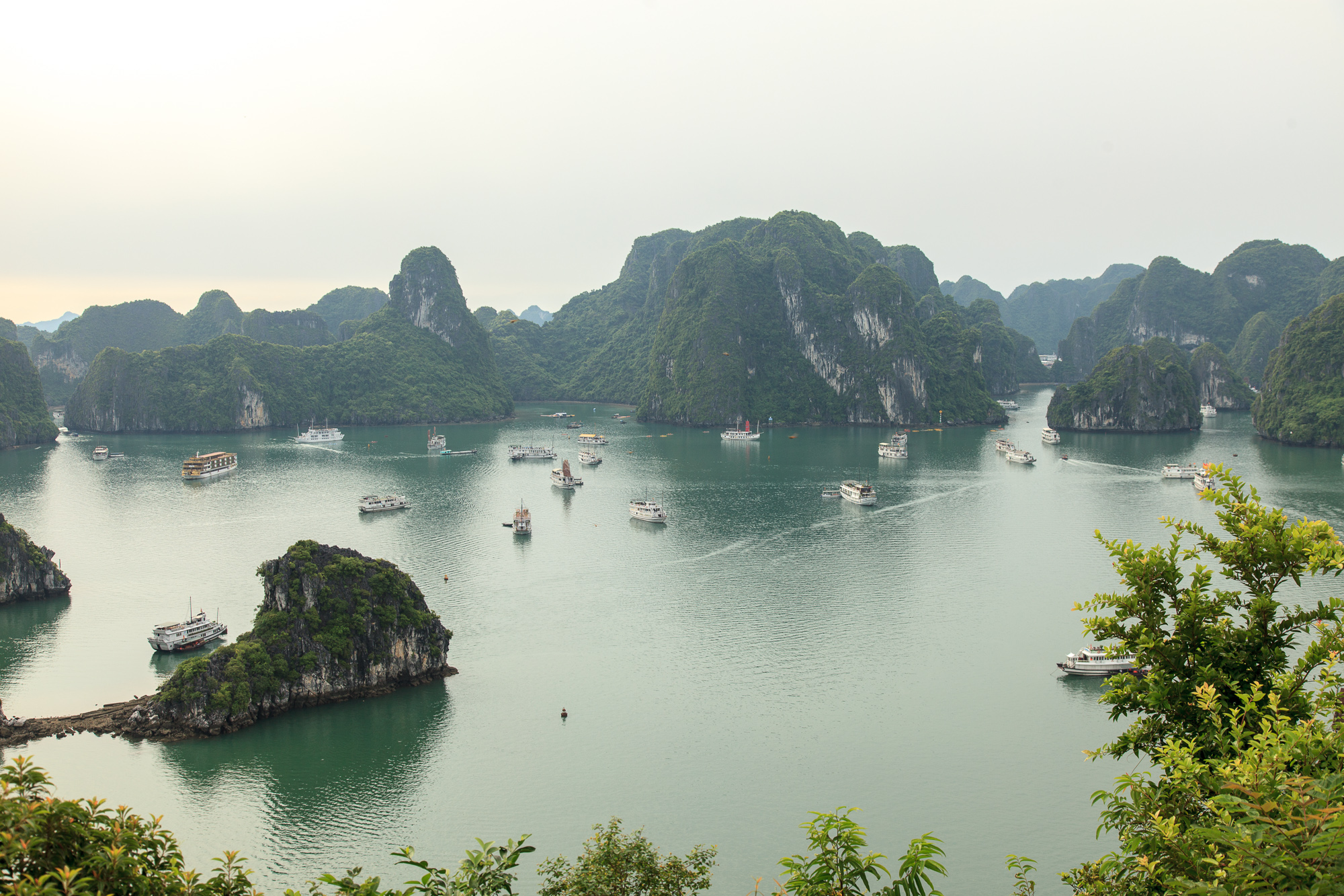 Правда надо понимать, что те красивые фоточки с ярко-голубыми небом и морем, которые украшают все буклеты и путеводители про Халонг, сделать скорее всего не получится: бОльшую часть времени над заливом висит тонкая белесая дымка, и небесной синевы почти никогда не видно. Виды все равно отличные — но чуть менее открыточные, чем можно было бы ожидать.