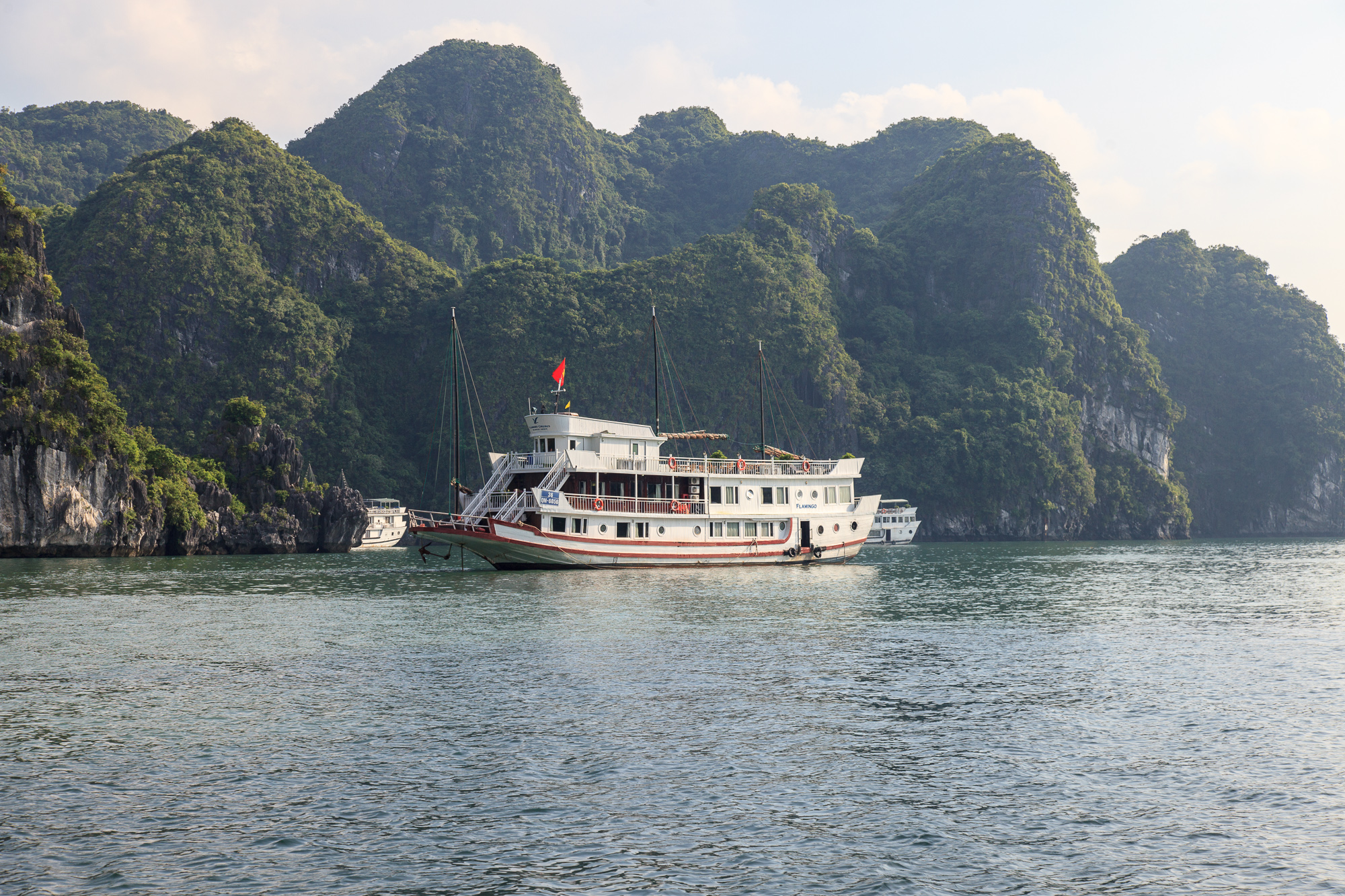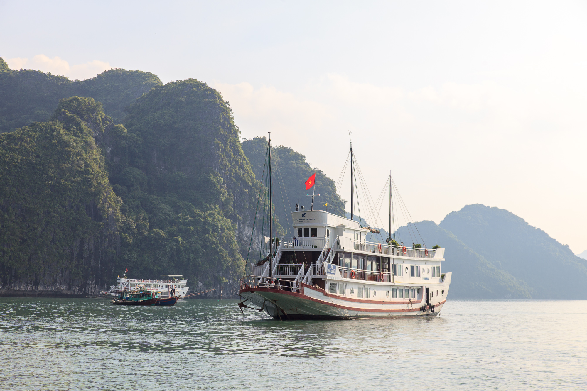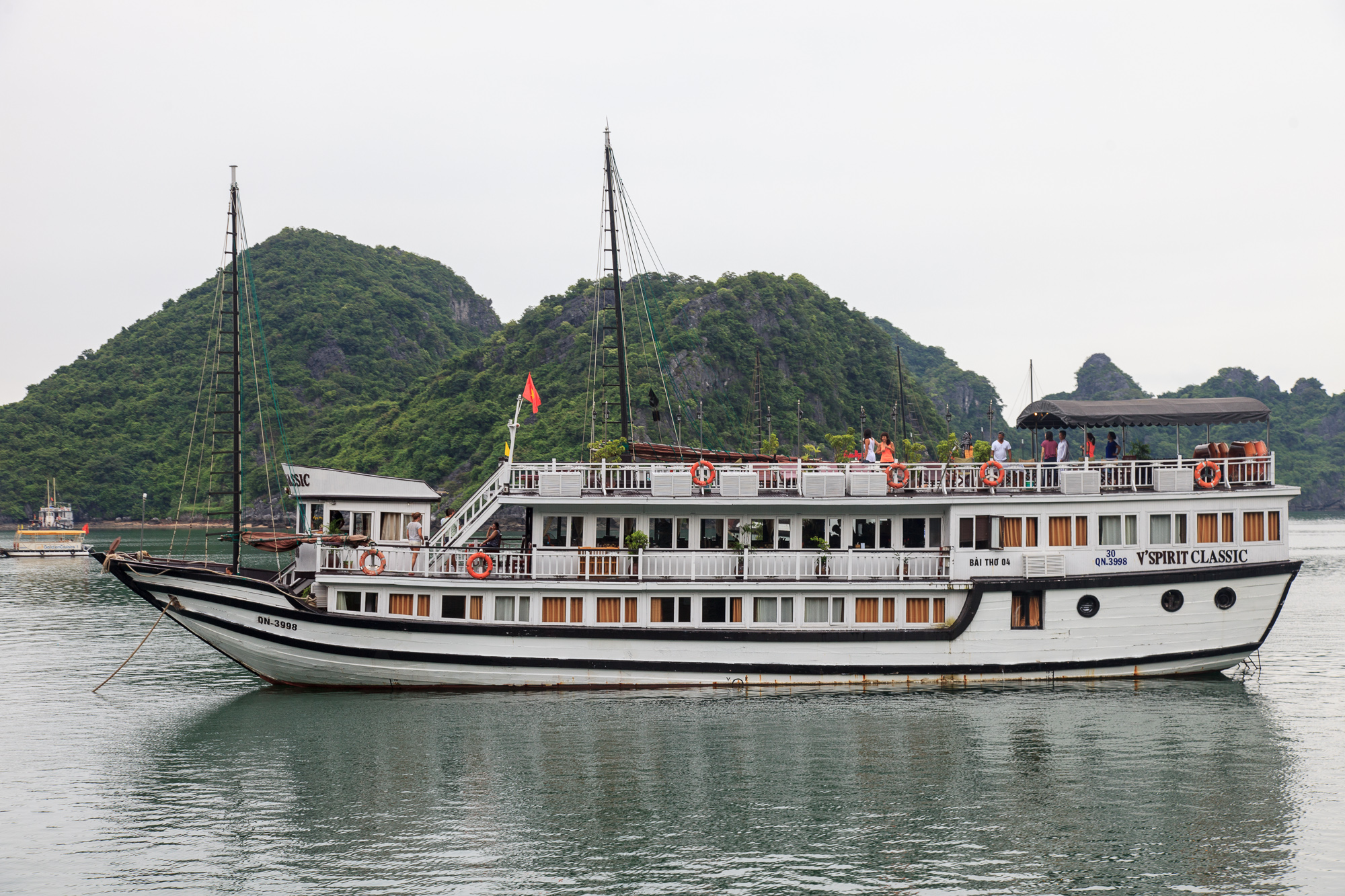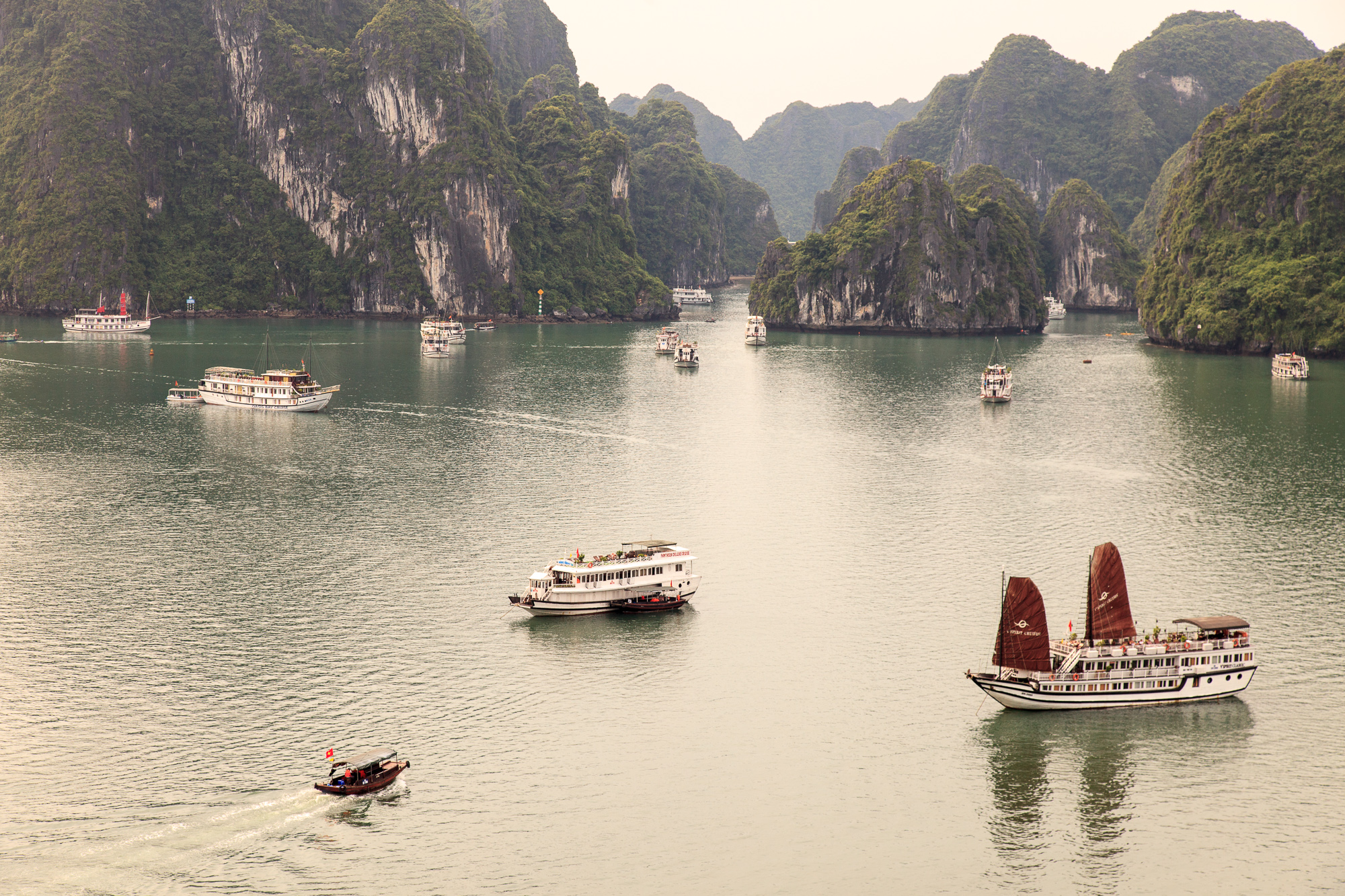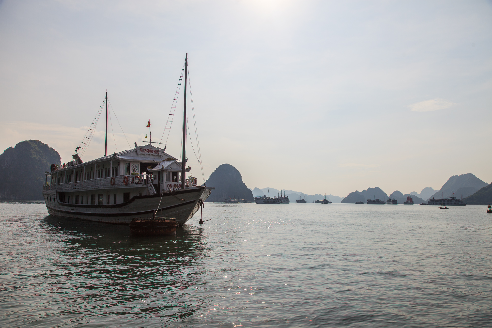 Кораблей, ходящих круизами по Халонгу, великое множество: от здоровенных многопалубников на пару сотен пассажиров, до маленьких яхт на одну семью. Те, которые предполагают ночевку на борту, оснащены салонами и каютами разной степени комфортности, а те, что предназначены только для дневных прогулок, предлагают только сидячие места а-ля речные трамвайчики. Общая черта большинства кораблей — мачты, на которых можно поднимать складчатые паруса специфической формы, придающие кораблям сходство со старинными китайскими джонками, издревле ходившими в этих водах. Насколько я успел понять, паруса эти несут чисто декоративную функцию на радость туристам, поднимают их, соответственно, нечасто и ненадолго — но выглядит действительно красиво.