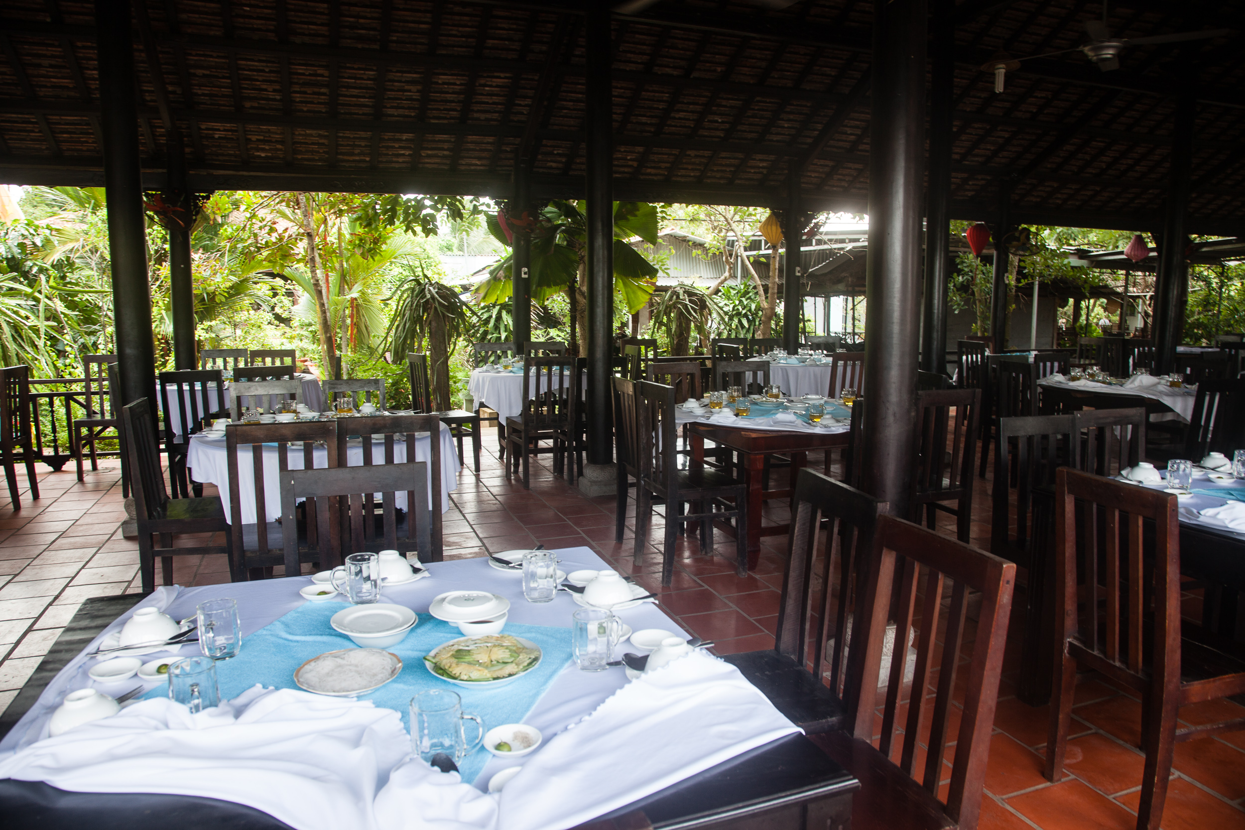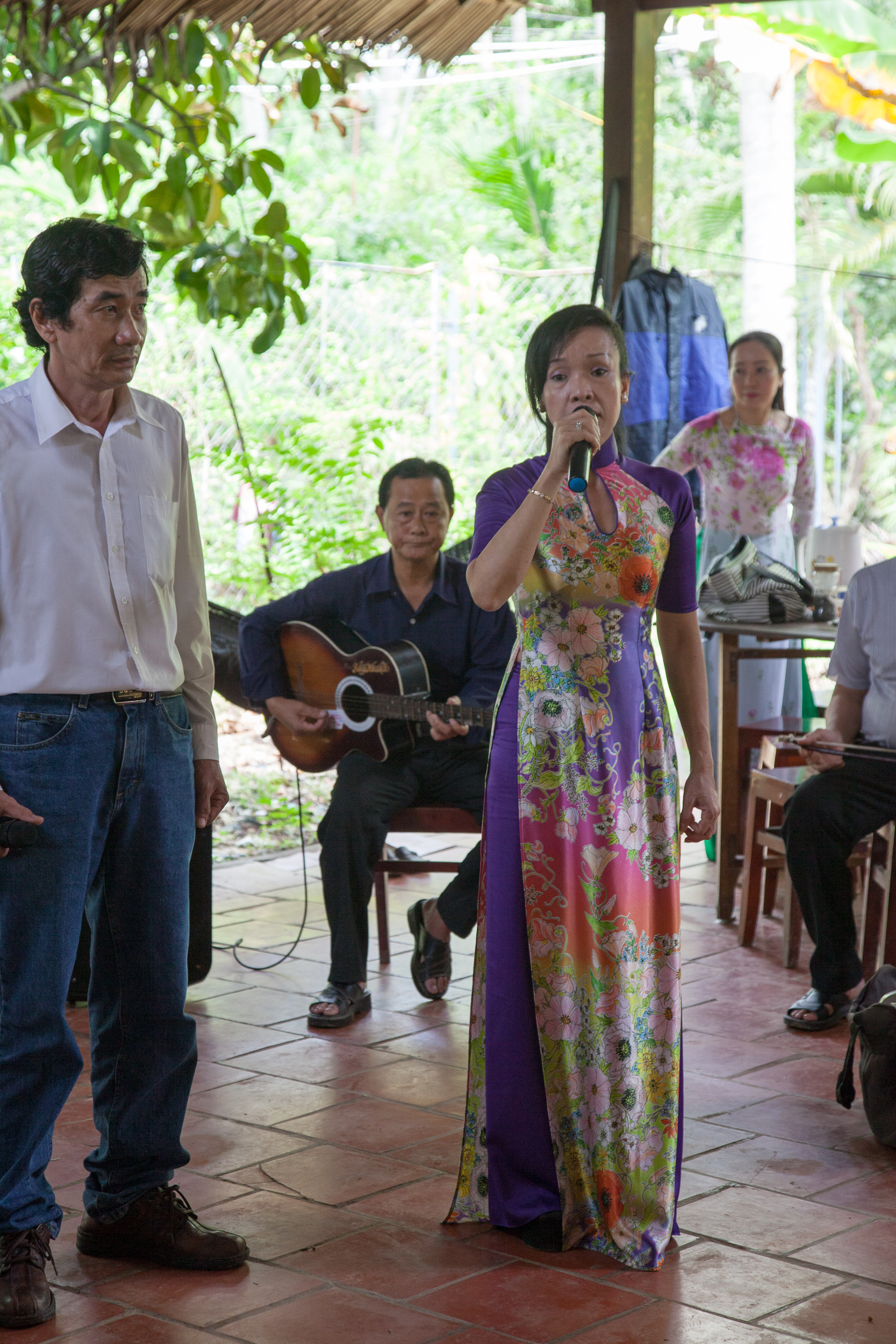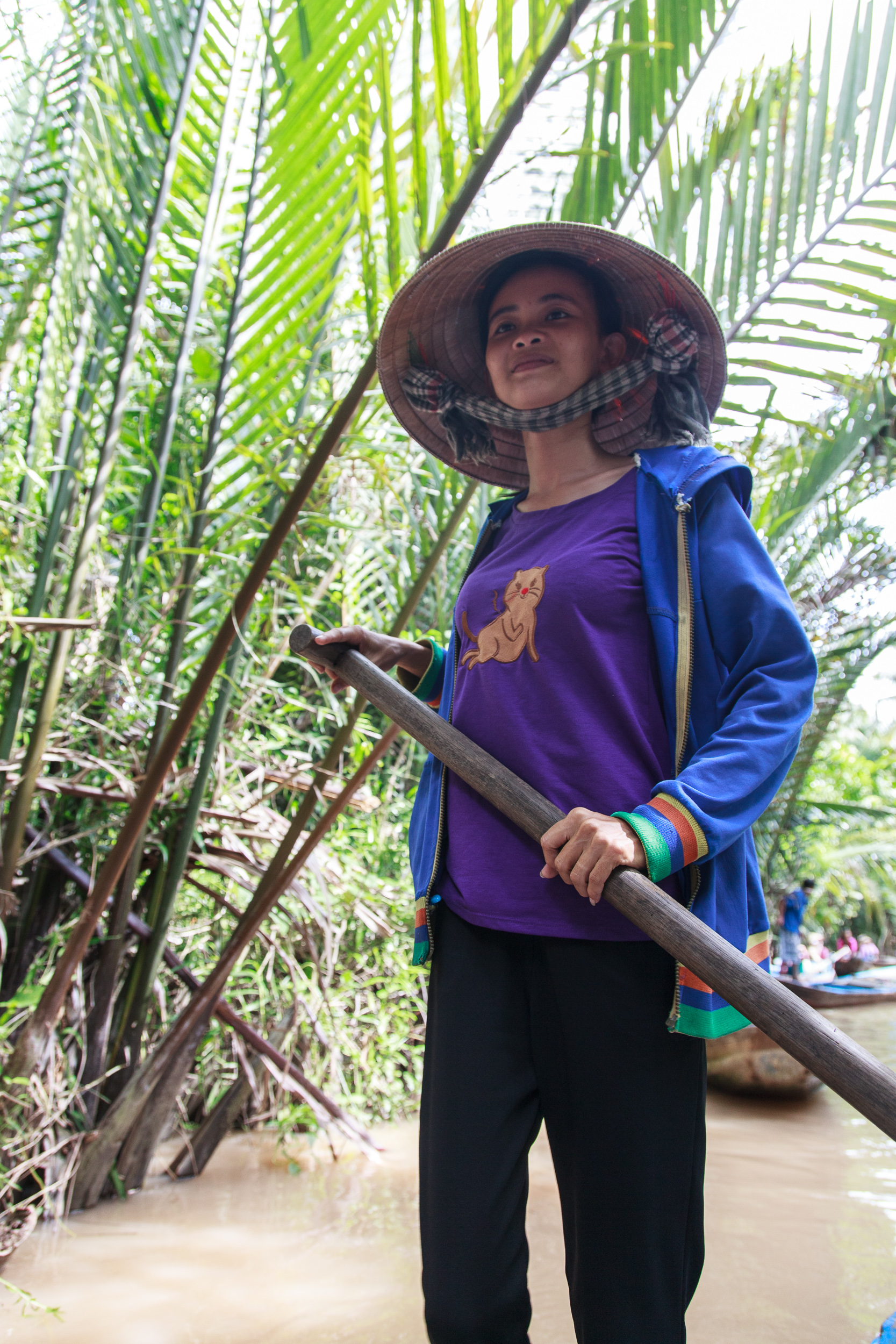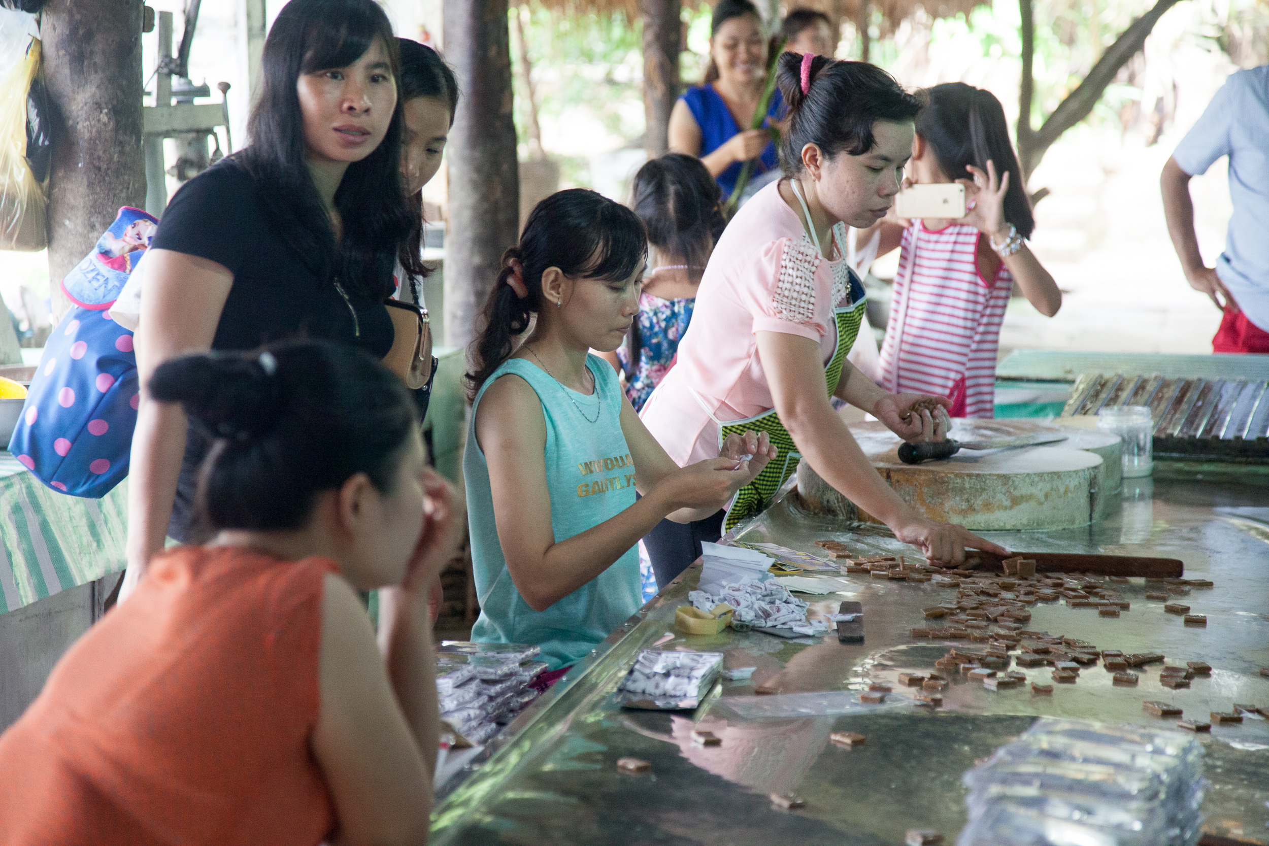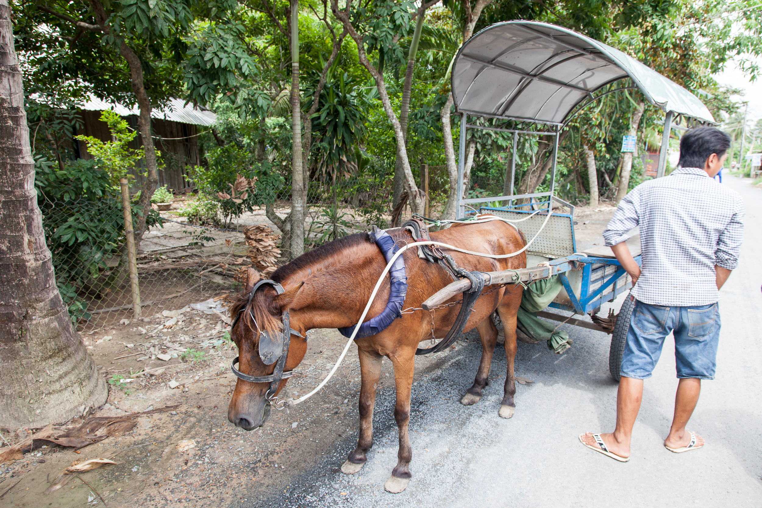Соответственно, программа получилась примерно следующей: выезд из Хошимина на автобусе в сторону My Tho, около двух часов дороги, там пересадка на большую моторную лодку с навесом, переход на ней на остров Con Phung, на котором расположена большие кокосовая и банановая плантации. Осмотр этих плантаций, потом — обед. После обеда отплытие дальше, на какой-то следующий остров, а там — осмотр пасеки с дегустаций местного мёда и чая, потом поездка через деревню на тележках-двуколках, запряженных низкорослыми лошадками. Затем — перекус фруктами, сопровождаемый каким-то шоу с исполнением вьетнамской народной музыки. Потом — плавание по речным протокам через густые джунгли на маленьких лодочках-плоскодонках, возврат на большую лодку, потом — посещение еще одного острова, на котором расположена кондитерская фабрика, возврат по реке обратно к автобусу и, наконец, дорога назад, в Сайгон. Всю дорогу с нами был довольно симпатичный англоговорящий гид, рассказывавший про особенности местной фермерской жизни и показывавший различные ее плоды. Ну, и всё это, конечно, сопровождалось неприменными остановками у сувенирных магазинов и прочими традиционными для подобных экскурсий вещами вроде жамкания ручного питона. Последнего, конечно, хотелось бы избежать — но для этого нужно было не лениться при организации поездки :)